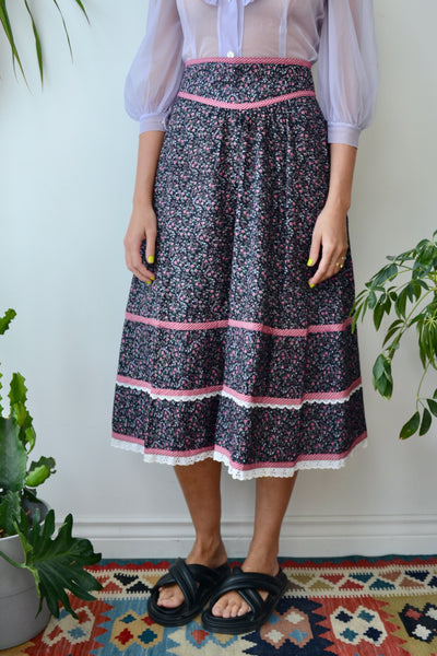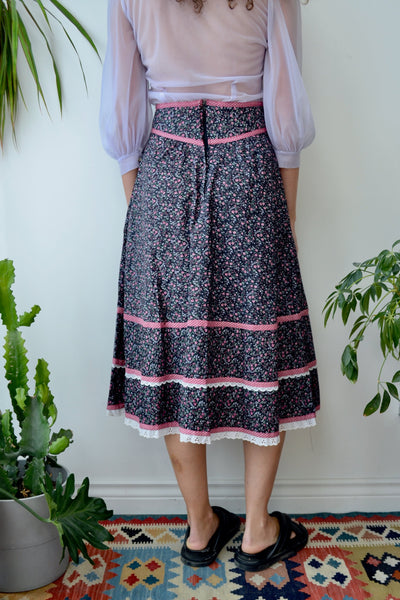 Seventies "Gunnies" Black Floral Prairie Skirt. Lace Trim. Zipper Closure Up Back. Two Hip Pockets. Unlined.