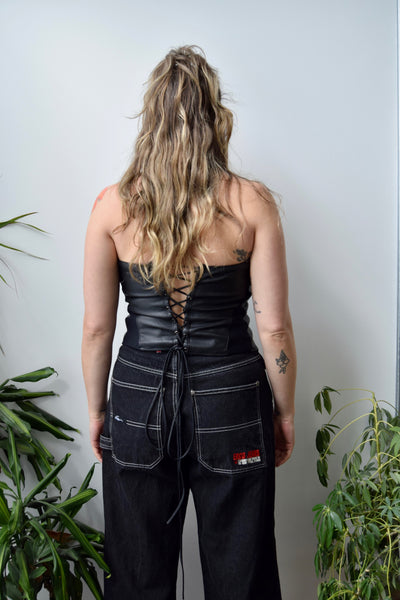 Harley Davidson Bustier Halter Top. Embroidered HD Wings Along Front. Zip Closure Along Front. Lacing Detail Along Back. Stretch Panels Along Sides. Lined.