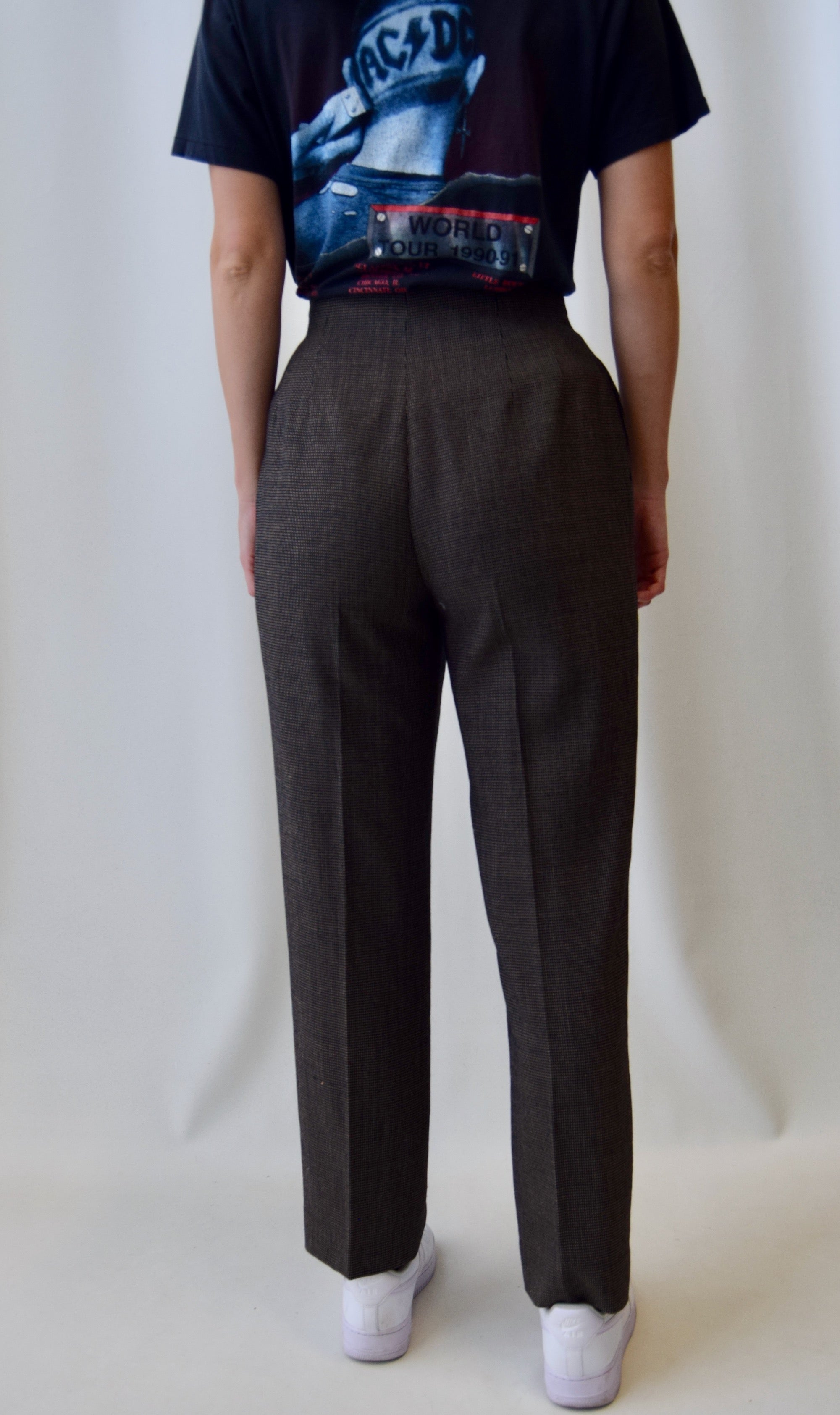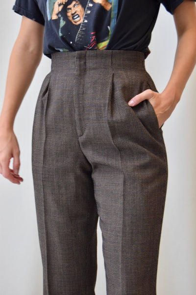 Super High Waisted Pleated Brown Trousers With Two Hip Pockets. Trousers Are Lined. Two Hook Closures At Waist With Zipper.