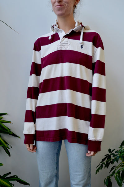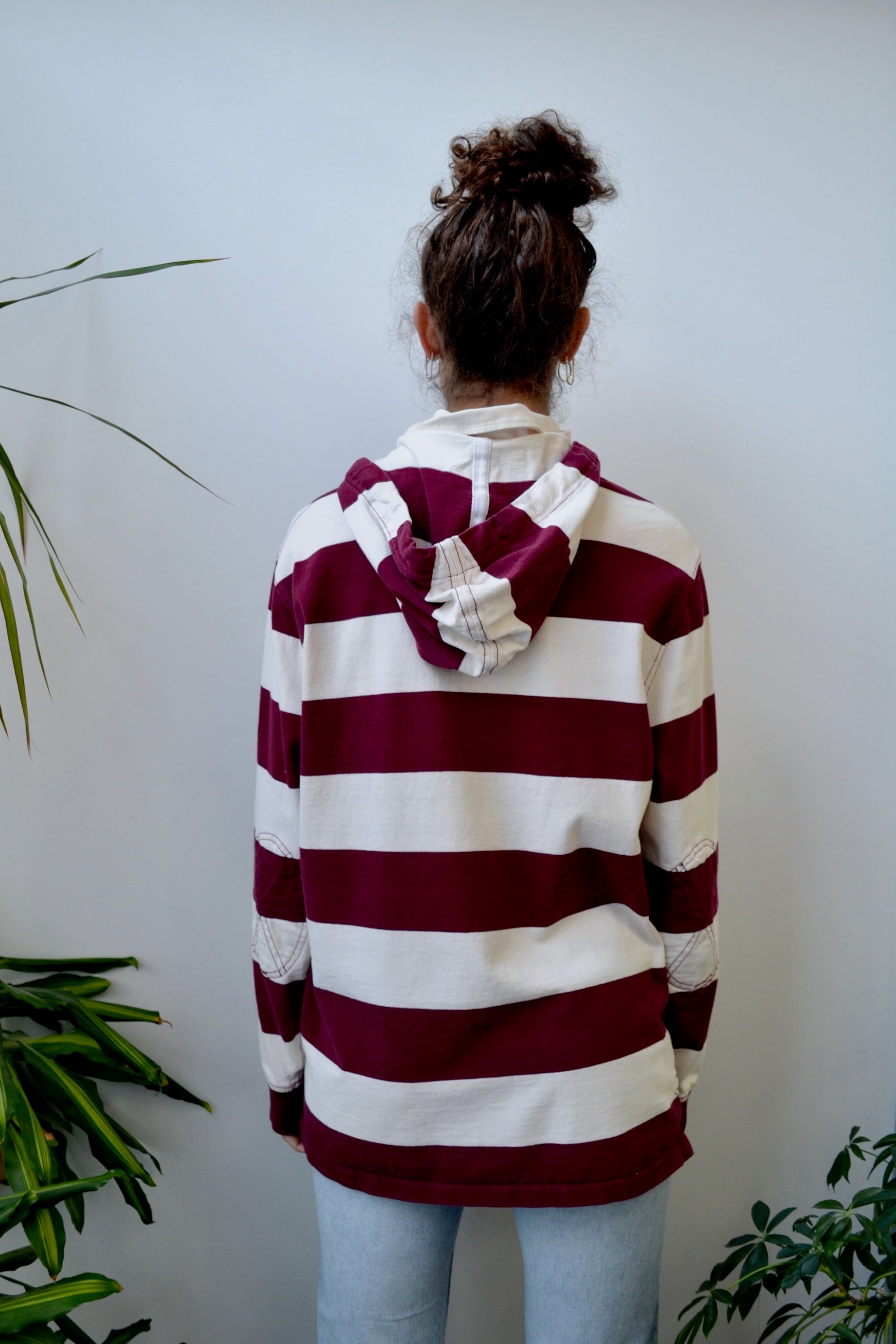Vintage 90s Burgundy And White Striped Polo By Ralph Lauren Hooded Rugby Shirt. Padded Elbows. Armpit Vents.
