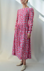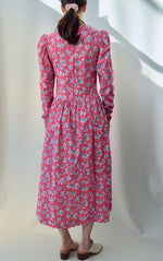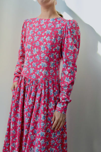 High Neck Floral Dress With Fitted Body And Full Hip. Puff Sleeves And Hip Pockets. Center Back Zipper Closure.