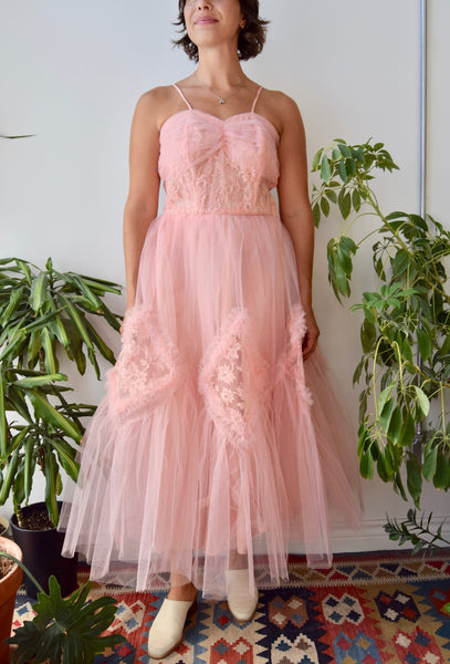 Fifties Pink Tulle Prom Dress. Metal Jet Zipper Closure Up Side. Boning In Bodice. Lined.
