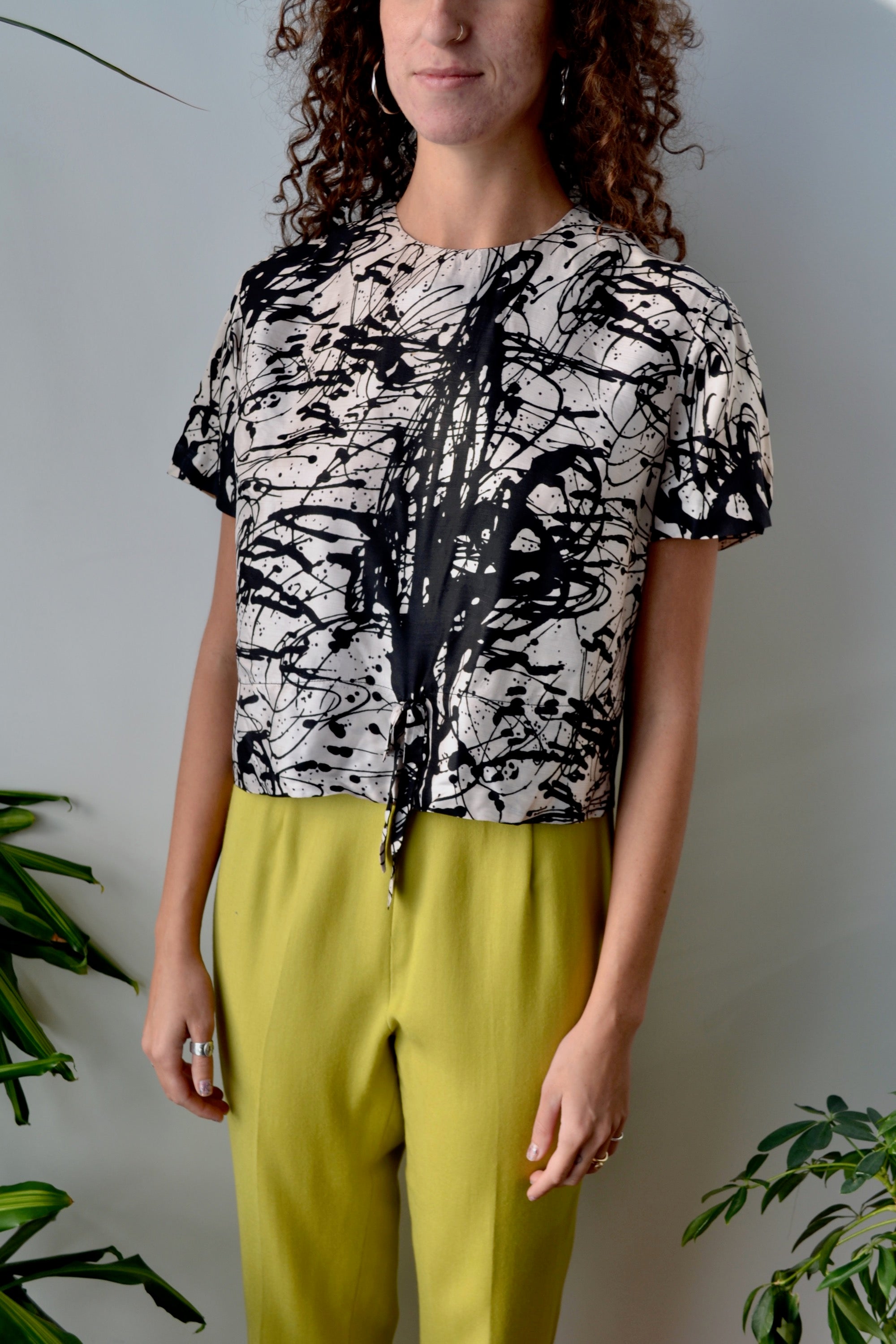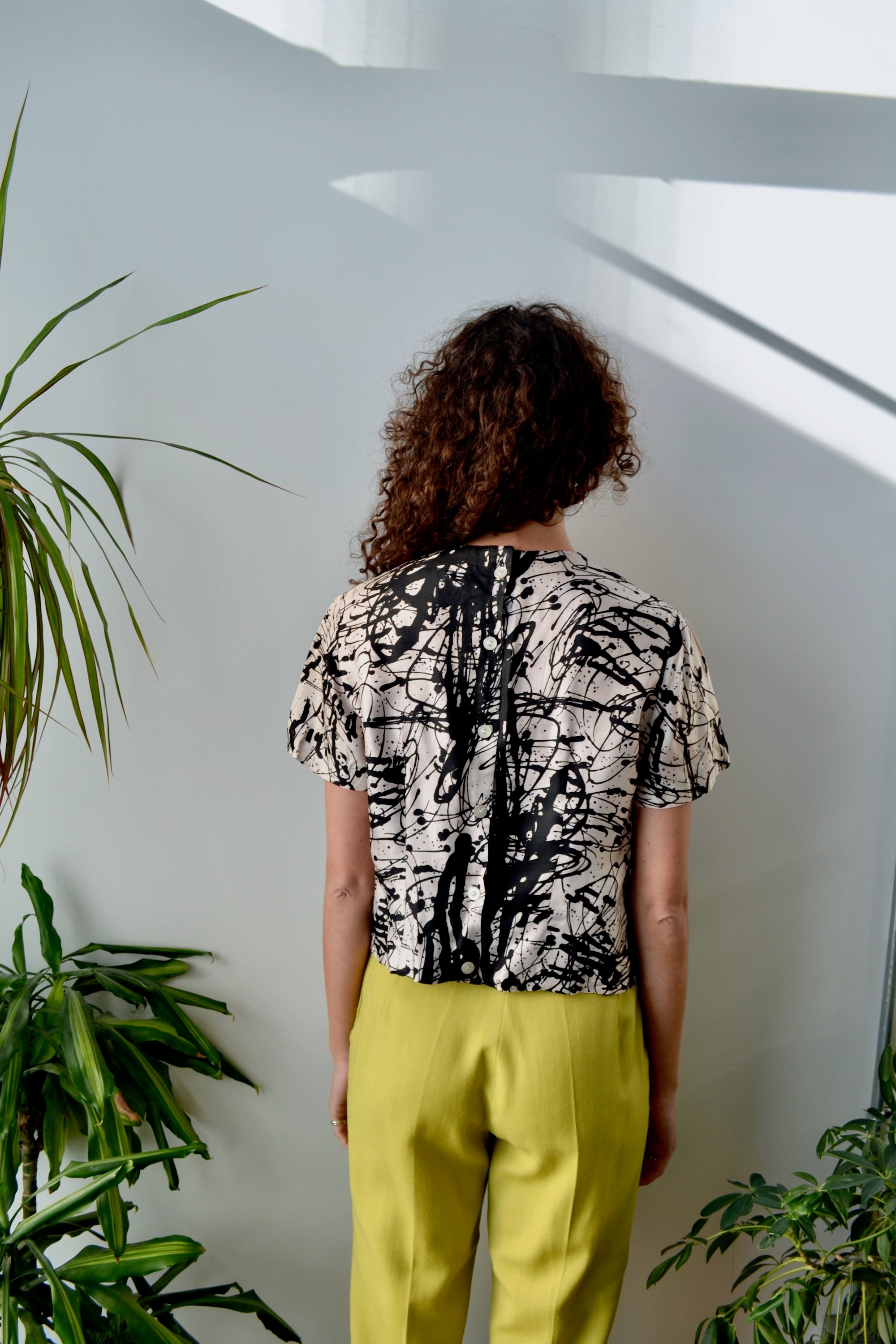 Sixties Light Pink And Black Abstract Pattern Blouse. Button Closure Up Back. Front Bow Detail. Unlined.