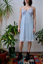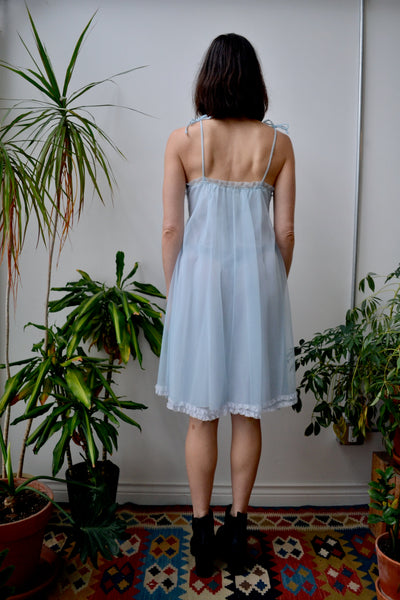 60s/70s Baby Blue Lace Ruffle Nightgown. Tie Up Spaghetti Straps. Elastic Upper Back. Semi Sheer. Lined.