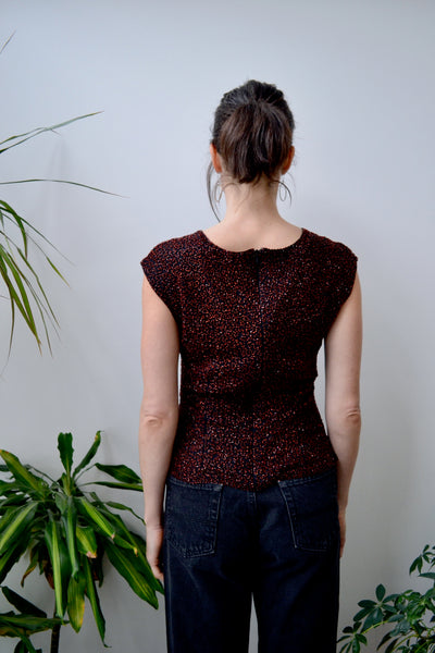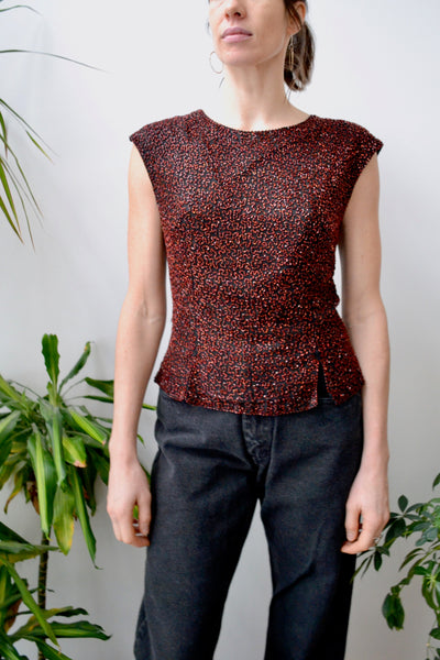 Vintage 1980s "Laurence Kazar" Beaded Silk Blouse. Black Fabric With Red Beads. Cap Sleeves. Zipper Closure Up Back. Tailored Waist. Lined.