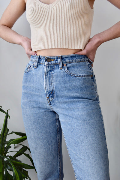 Levis Light Wash 521 Jeans. High Waist. Zipper Fly. Two Front Pockets, Two Back Pockets. Tapered Leg.