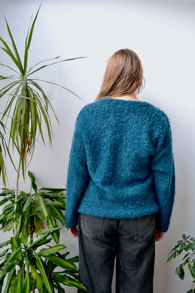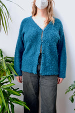 Dark Teal Mohair Blend Cardigan. Loop Button Closure Up Front. Unlined.
