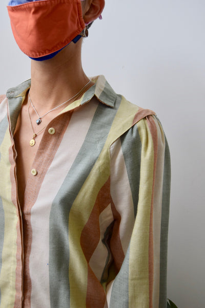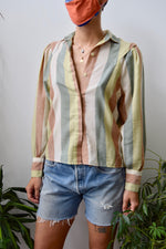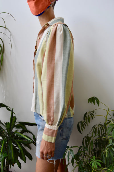 1980's Muted Stripe Blouse. Collared. Balloon Sleeves. Wonderful Seam Details. Button Closure Along Front.