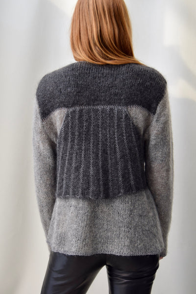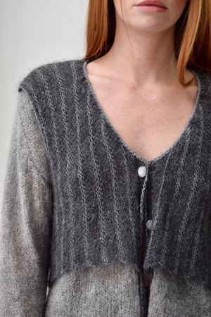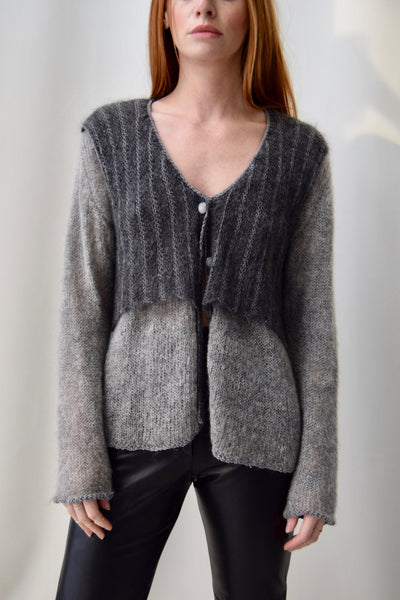 Grey Mohair Blend Cardigan With Dark Grey Faux Vest Overlay. Cord Trim Details Creating Stripe Effect And Along Edges Of Seams.
