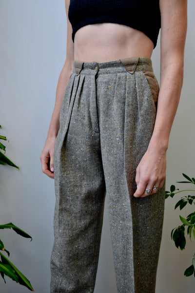 Eighties Tweed Trousers. Tapered Leg With Cuff Option. Cotton Geometric Details. Zipper Fly. Button Waist. Two Hip Pockets. Lined.