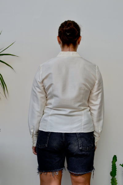 Nineties "Rafaella" Cream Silk Blouse. Empire Waist. Johnny Collar. Button Closure Up Front. Unlined.