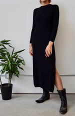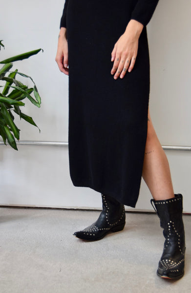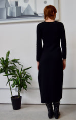 1990's Black Merino Wool Dress by "Jacob". Collarless. Long Sleeves. Slit Along Left Leg. Unlined. No Closures.