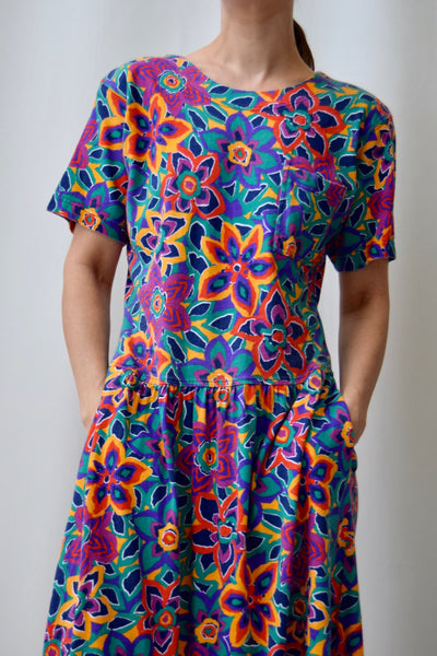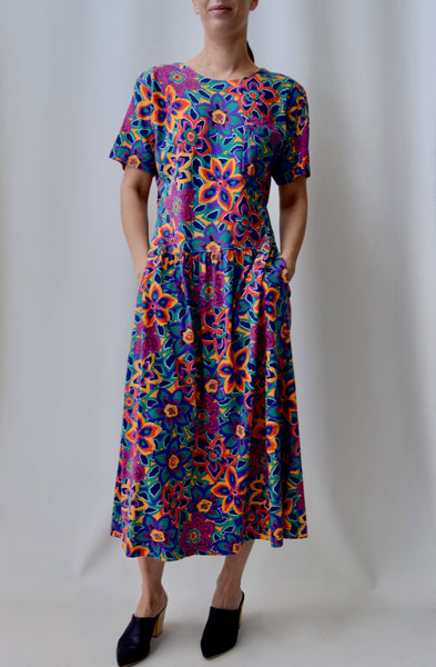Nineties Floral T-Shirt Cotton Dress by "Nordstrom". Drop Waist. Unlined. POCKETS!