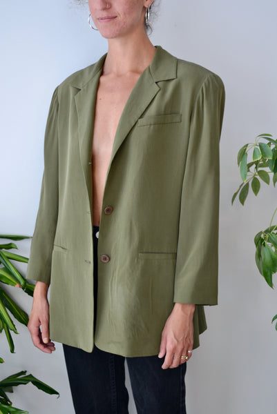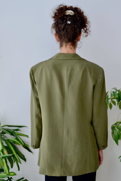 Olive Green Silk Blazer. Collared. Faux Pockets. Lined. Padded Shoulder.
