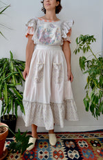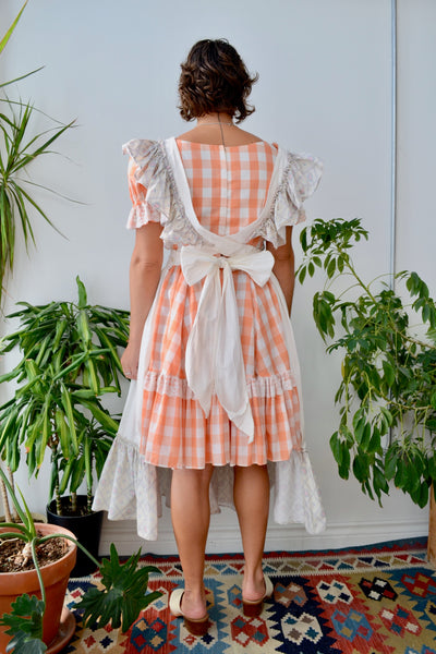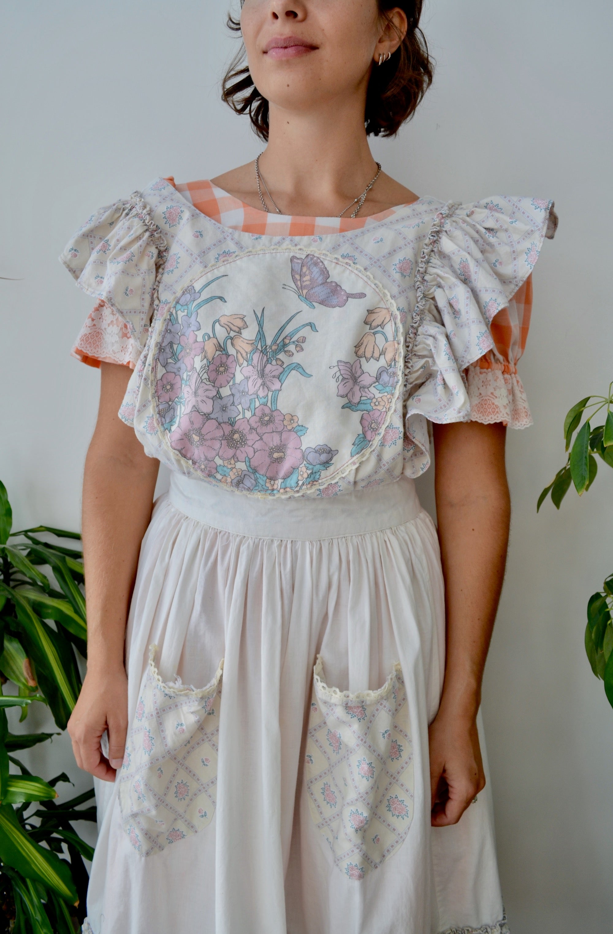 Vintage 60s/70s Floral Ruffle Pinafore Apron. Criss Cross Ruffle Straps (Button Attached). Tie Sash Waist. Two Pockets. Unlined.
