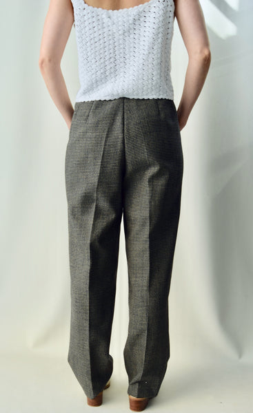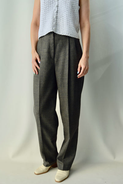 Liz Claiborne Trousers. Green and Blue Mix Houndstooth. 100% Wool. 2 Hip Pockets. Belt Loops. Front Button and Zip Closures. Lined Inside.