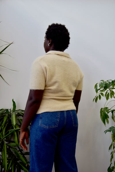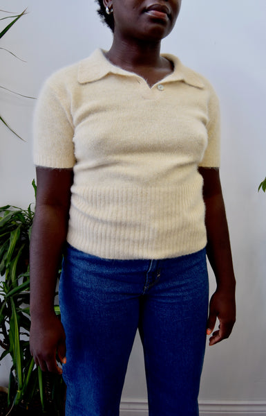 Knit Angora Sweater. Collared. Button Neck Closure. Ribbed Waist.