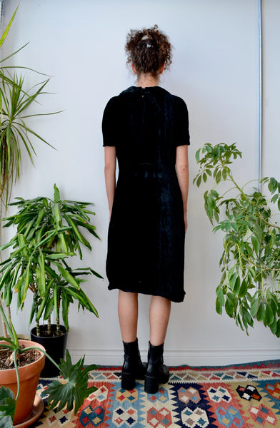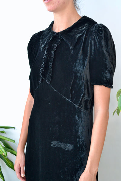 Vintage 1940s Black Velvet Dress. Metal Talon Zipper Closure Up Side. Two Button Neck Closure. Ruffle Detail Up Front. Puff Sleeves. Unlined.