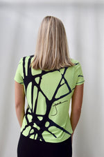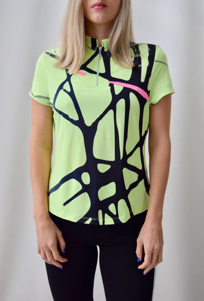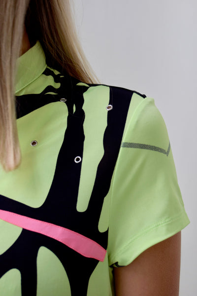 Jamie Sadock Neon Printed Polo Half Zip. Grommet Details And Pink Applique.