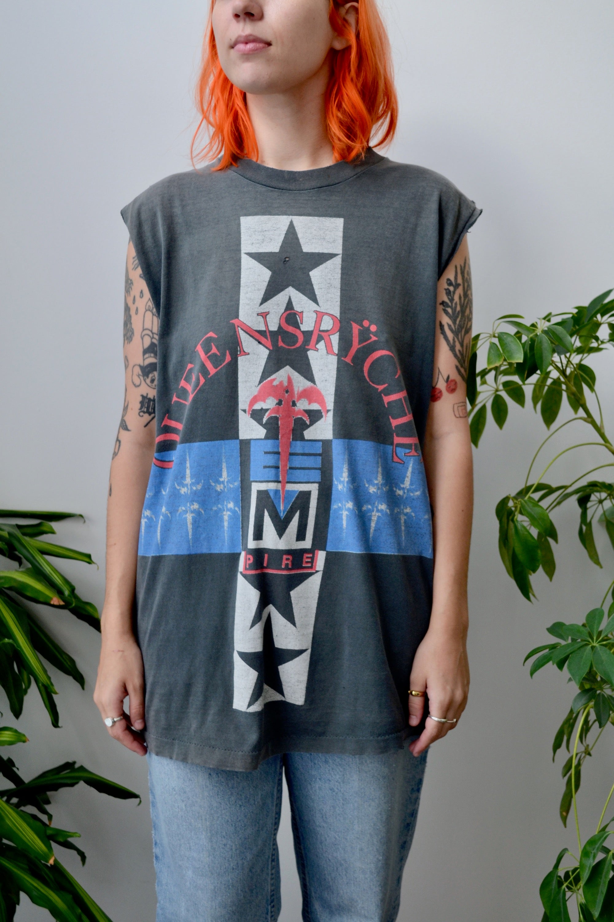 1990s Queensrÿche Empire Tour Tee. Double Sided. Single Stitch. Giant Extra Heavyweight Label. Cut Off Sleeves.