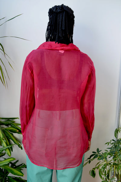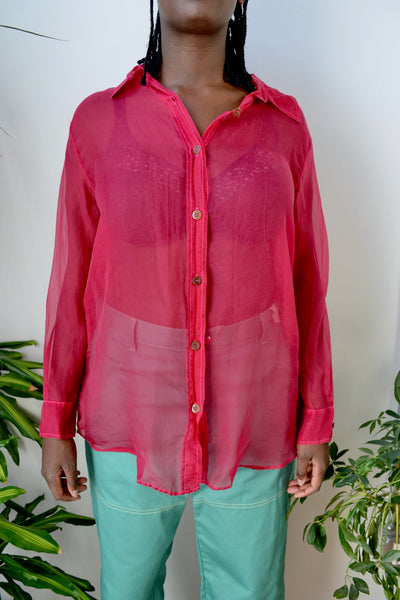 Dark Pink Sheer Silk Blouse. Button Closure Up Front. Classic Collar. Unlined.