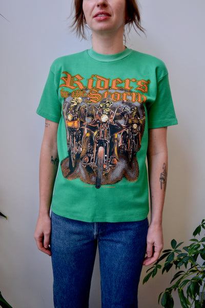 Green "Riders in the Storm" Skeleton Motorcycle Single Stitch Tee. Kenny Kramer Copyright MFG by Air Waves Inc.