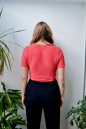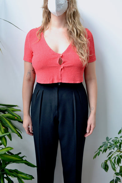 Salmon Pink Textured Cropped Cardigan Top. Short Sleeves. Two Button Closure. Unlined.