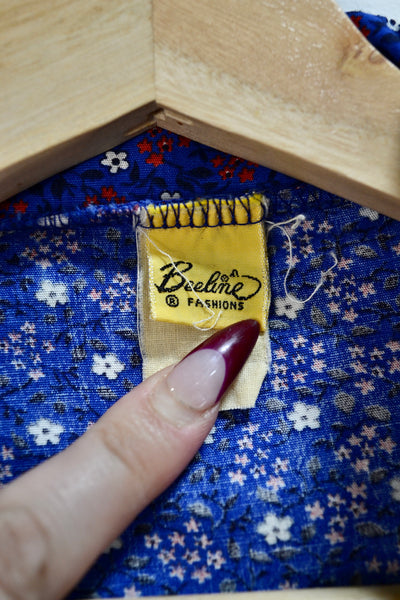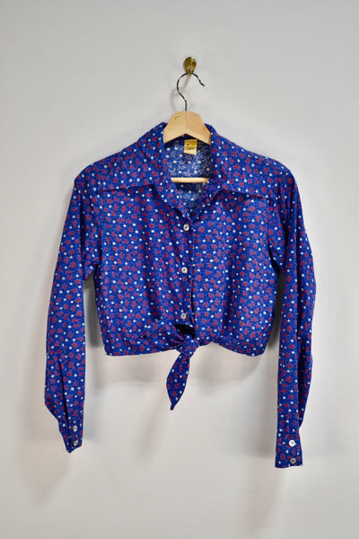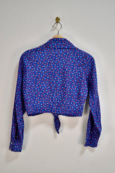 Vintage Seventies/Eighties Westerny Blue Floral Tie Top. Button Closure in Front. Pointed Collar.