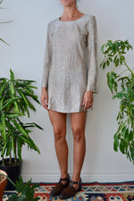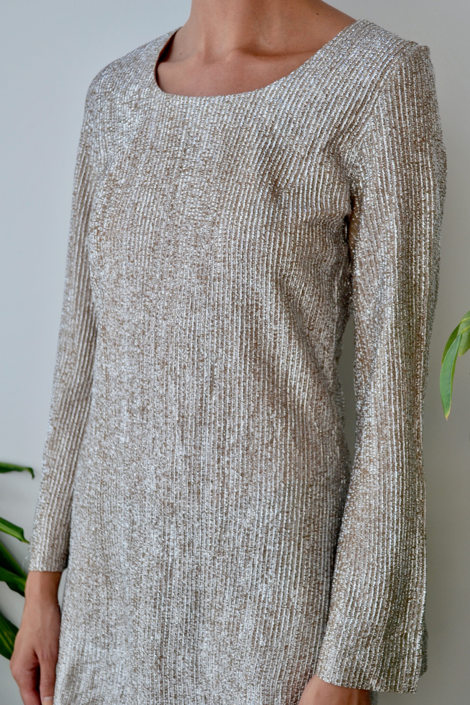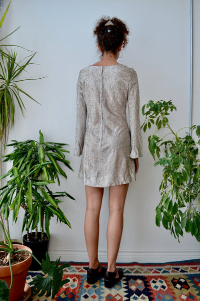 1970's "Young Edwardian" Tinsel Dress. Champagne and Silver. Bell Sleeves. Unlined. Zipper Closure Along Back.