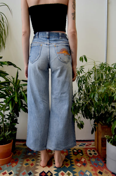 1970's H.A.S.H. Wide Leg Jeans. High Waist. Light Wash. Zipper Fly. Two Hip Pockets. Sunshine Embroidery on Back Pocket.