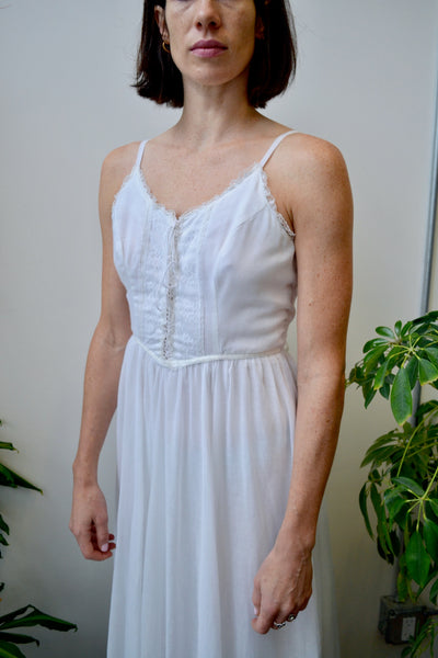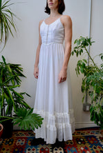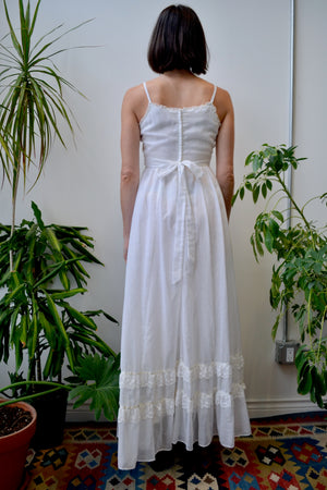 Vintage 1970's "Juniors Scene" Peasant Dress. Laced Chest Closure with Lace Bib. Ruffle Lace Hem. Zipper Closure Along Back. Lined. Waist Tie.