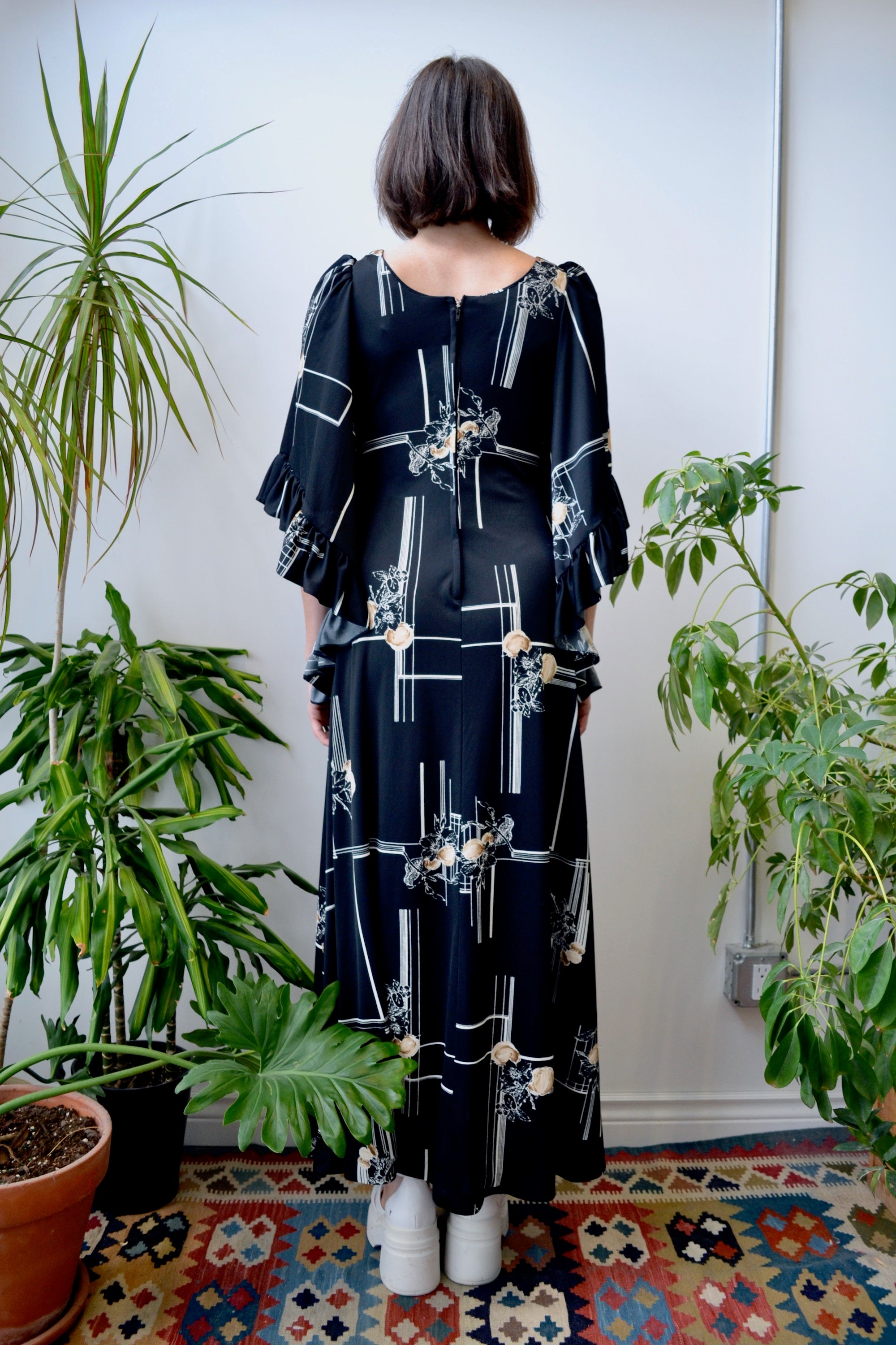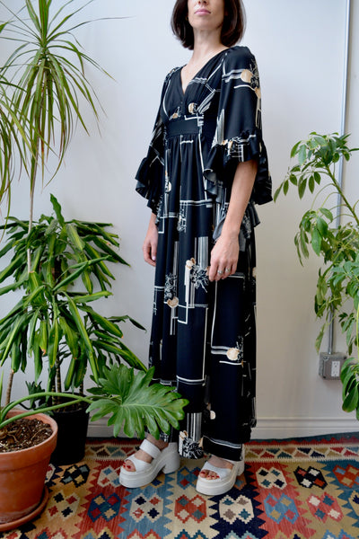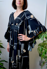 1970's Bell Sleeve Maxi Dress by "Nancy G". Empire Waist. Ruffled Bell Sleeves. Botanical Geometric Pattern. Unlined.