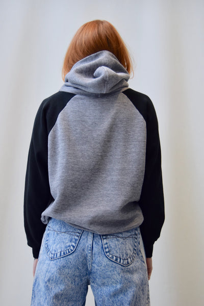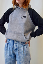 70's/80's Heather Grey and Black "Nike" Sweatshirt. Kangaroo Pocket. Hood. Blue Nike Tag. Poly Cotton Blend.