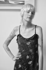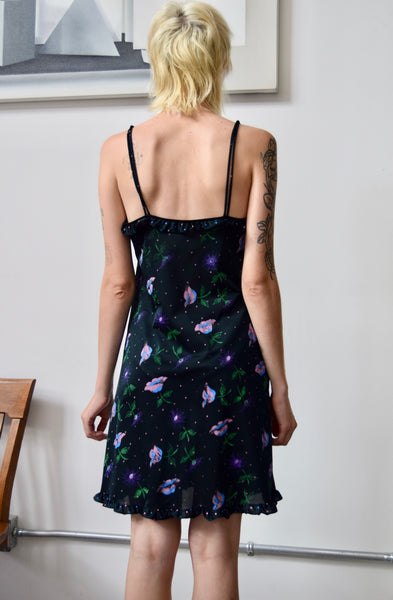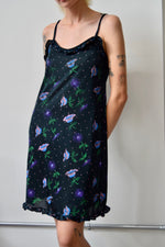 1970's Black Poly Slip Dress with Pastel Floral Pattern. Ruffled Neck and Hem Line. No Closures.