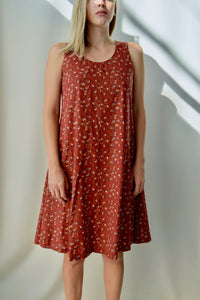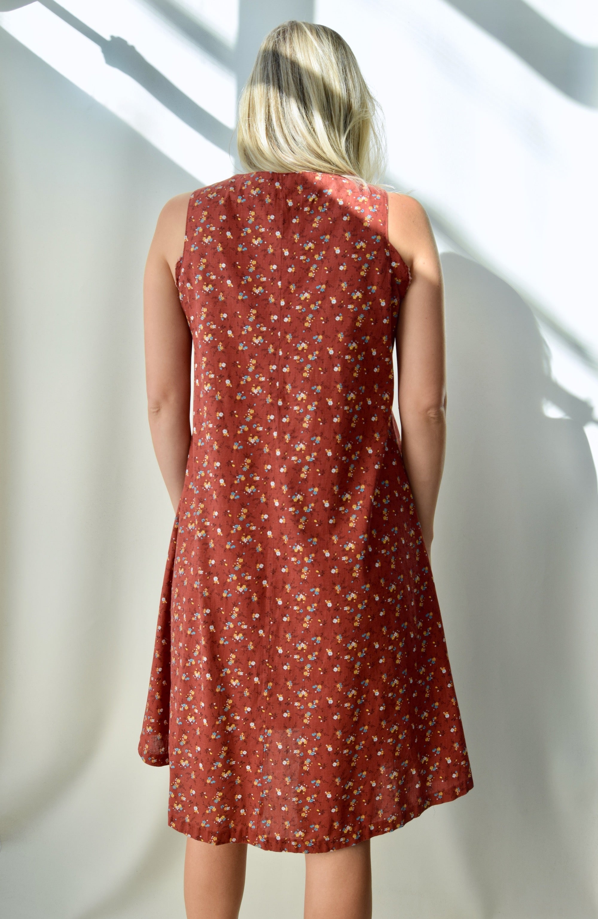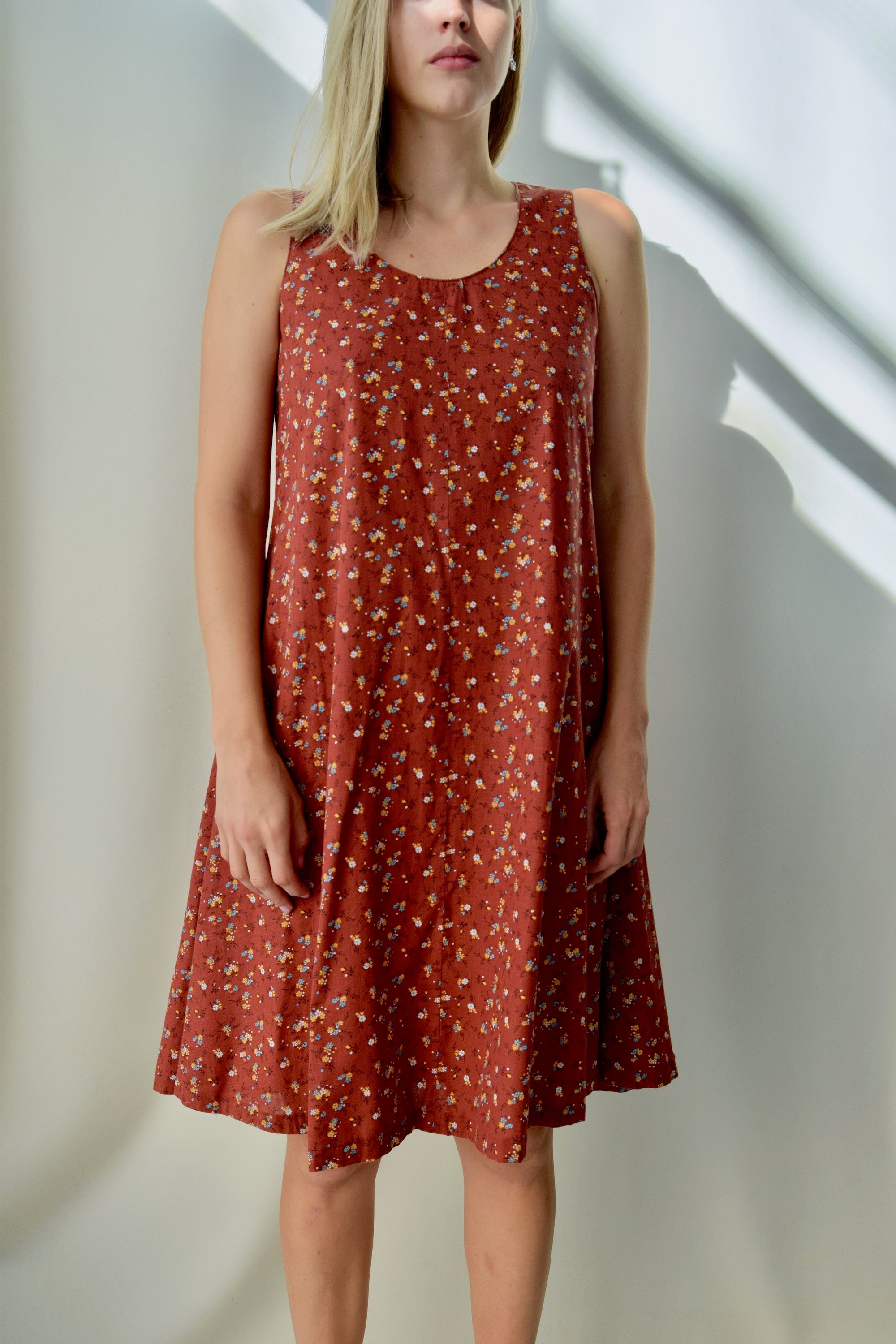 Rusted Brown 70's Dress with Blue and Yellow Wildflower Print. A-Line. No Closures. Two Hip Pockets. Unlined. Perfect For Layering!