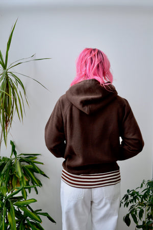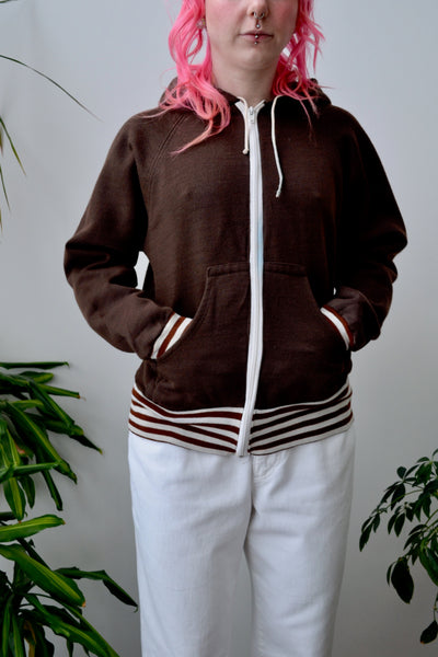 Seventies Brown Zip Up Hoodie. "Scrambler By Friton" Label. Striped Cuffs and Hem. Raglan Sleeves. Drawstring Hood. Two Pockets. Unlined.
