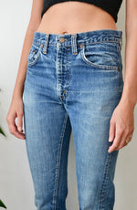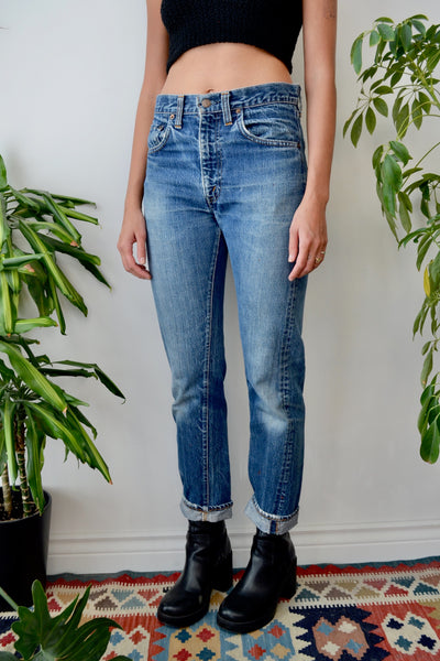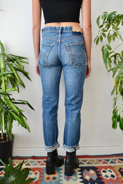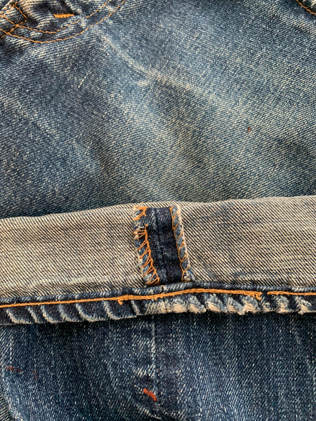 Late 1960's/1970s Big E Levis Jeans. Back Label is worn out but seems like a 505 style. Talon Zipper Fly. Five Pockets. Straight Leg.
