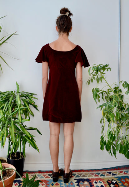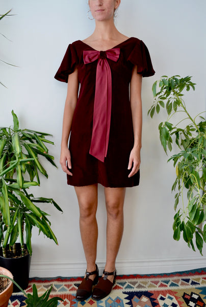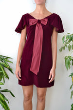 1960's Burgundy Mini Dress by "Algo-Ettes". Large Bow Detail. Flutter Sleeves. Zipper Closure Along Front. Unlined.