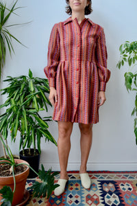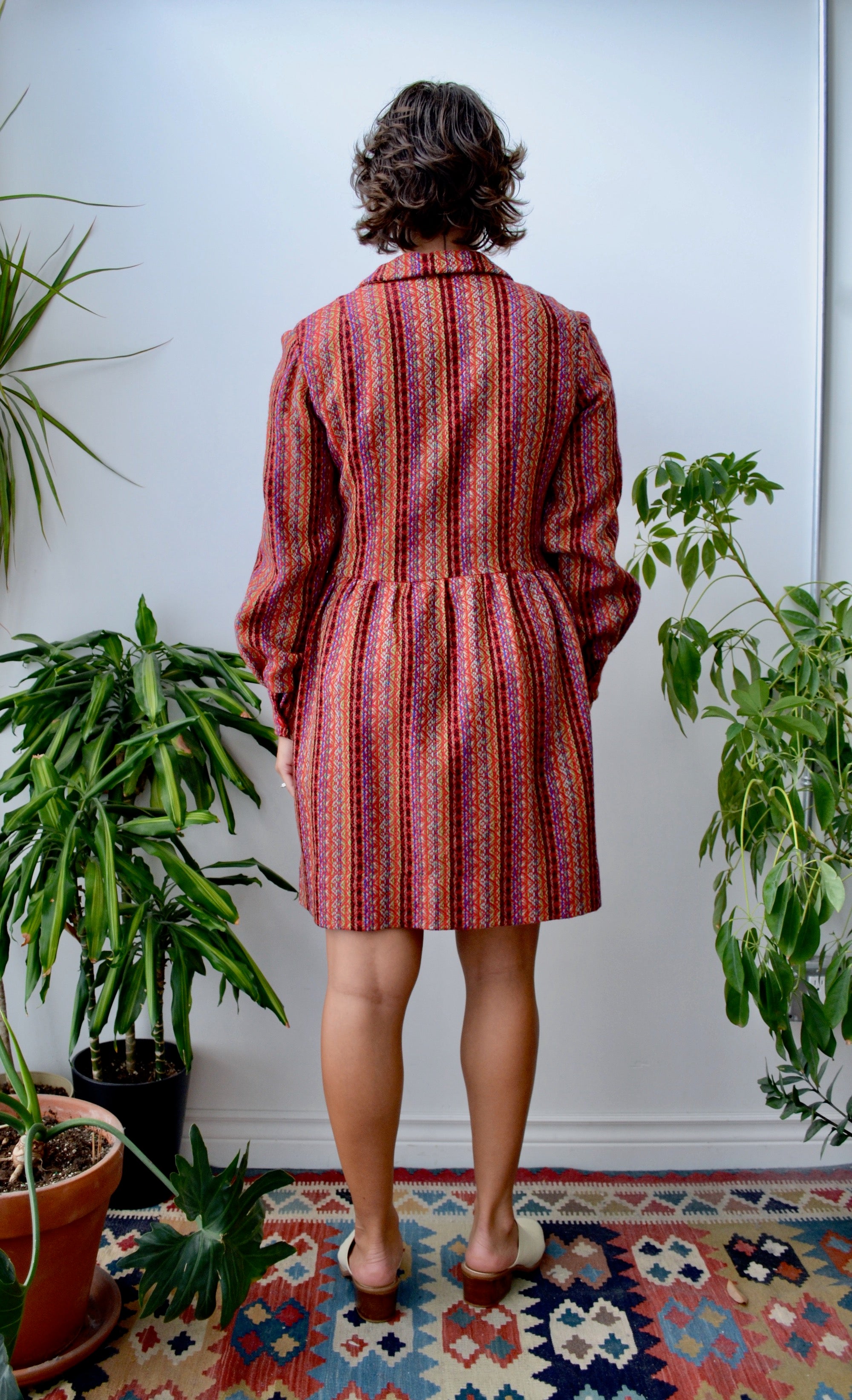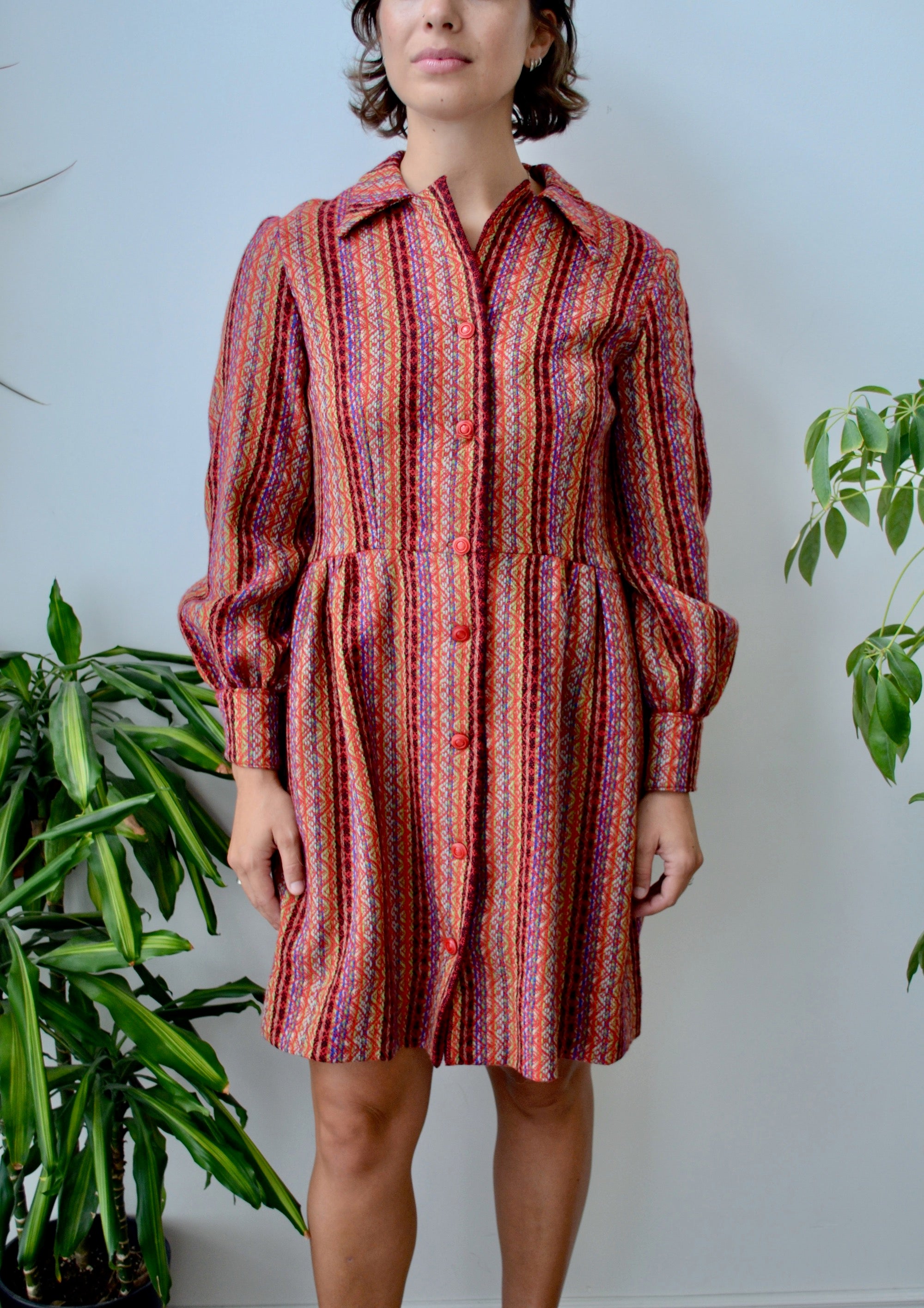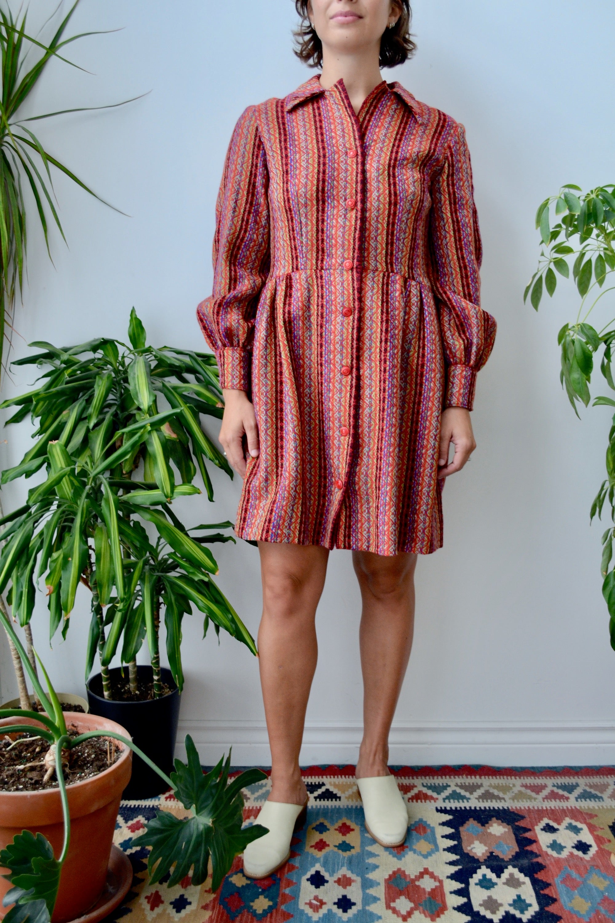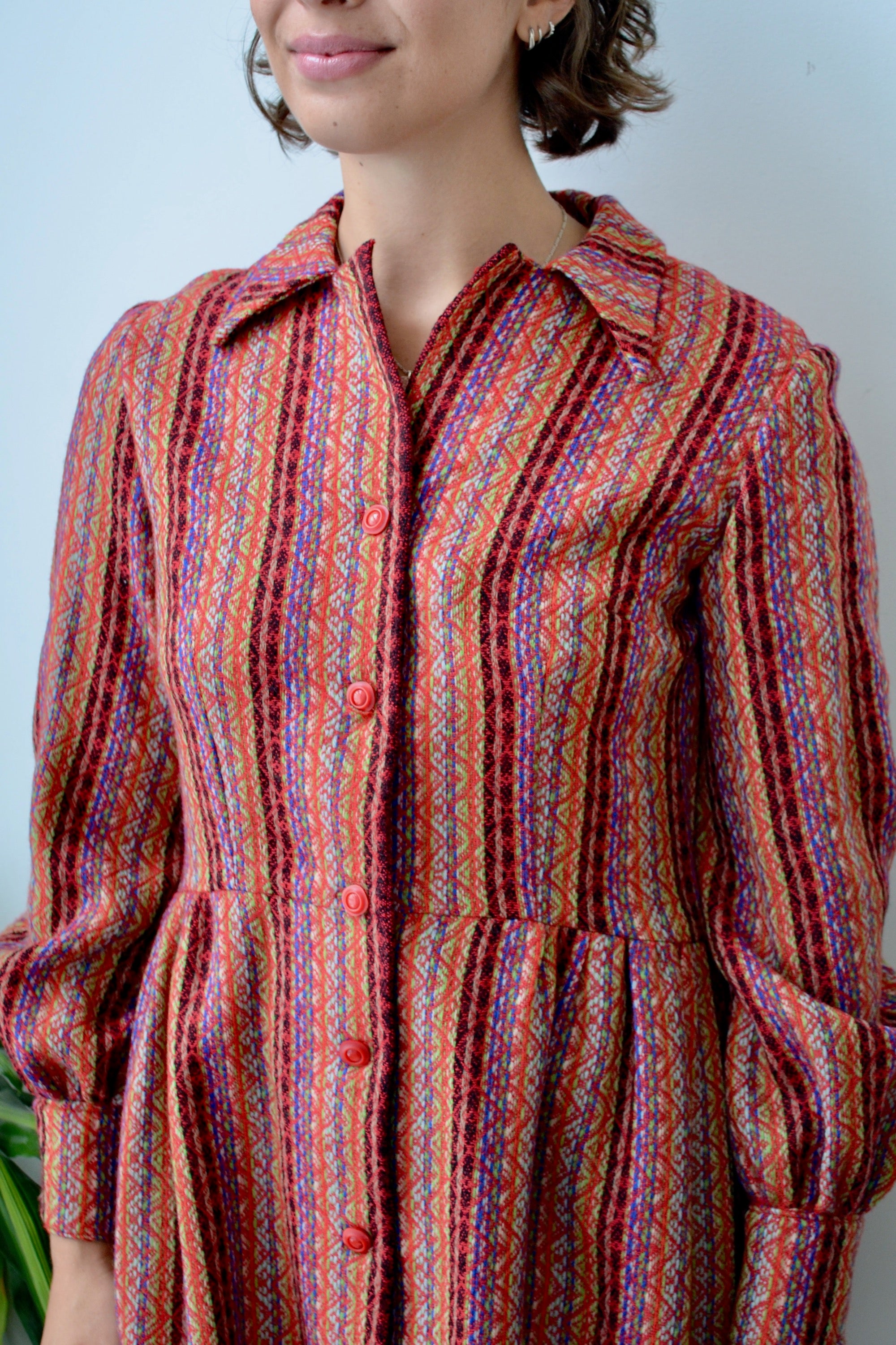 Vintage 1960's Red Woven Mod Dress. Collared. Button Closure Along Front. Unlined.