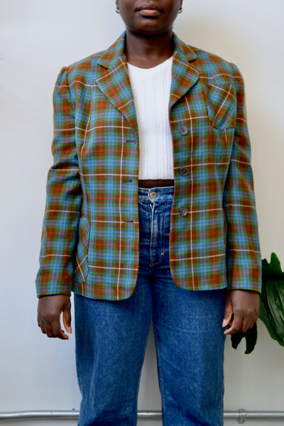 Sixties Green, Blue, Brown Plaid Blazer. Three Pockets. Shell Button Closure in Front. Lined. Notched Collar.