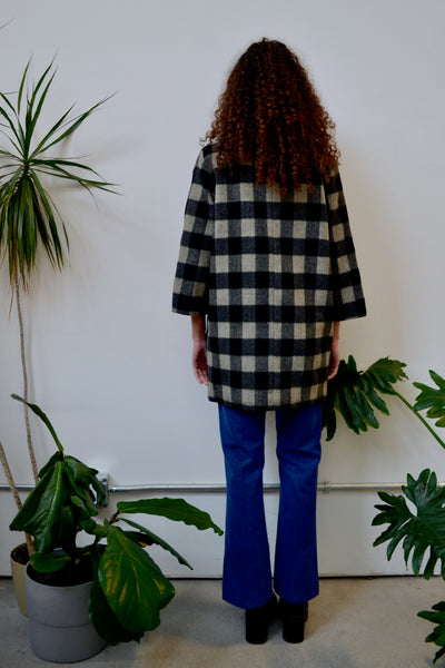 Fifties/Sixties Grey & Black Plaid Coat. 3/4 Sleeves. Two Front Pockets. Button Closure in Front. Lined. Oversized Off-Center Collar.