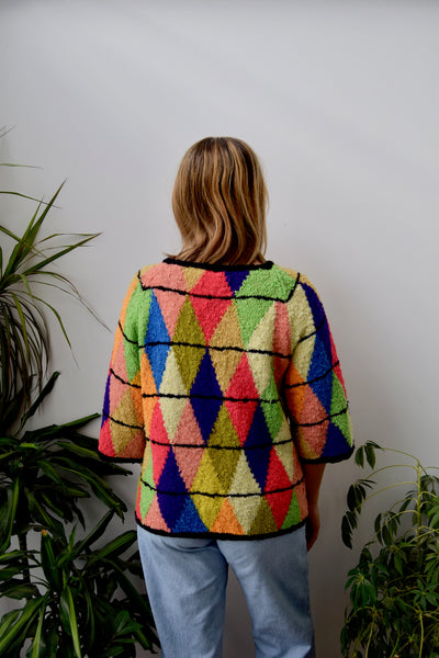 Sixties Diamond Pattern Raglan Sweater. Three Quarter Wide Sleeves. No Closures.