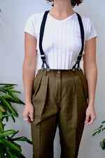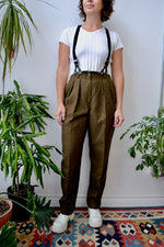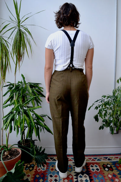 Nineties "Harris/Wallace" Brown Plaid Trousers With Stretchy Adjustable Suspenders. Zipper Fly. Double Button Waist. Pleated Front. Tapered Leg. Two Hip Pockets. Lined.
