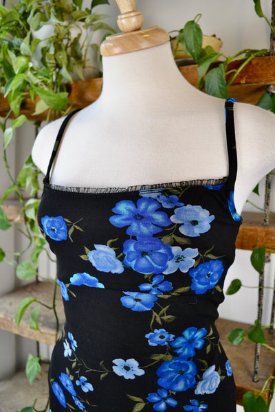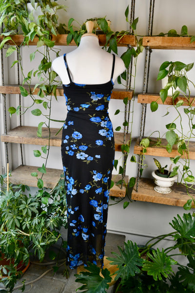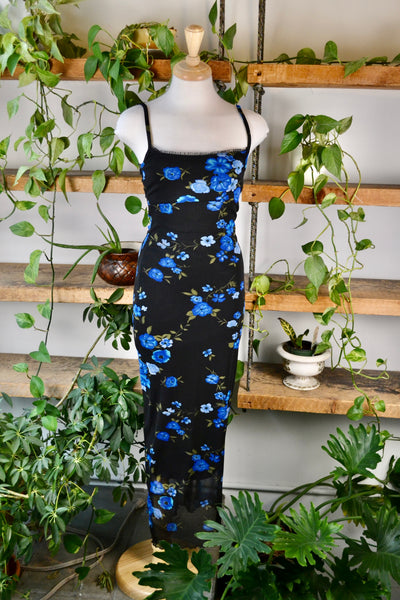 Vintage 90s/00s Black and Blue Floral Slinky Maxi Dress. Sheer Floral Overlay. Lettuce Hem. Lined. Square Neck.