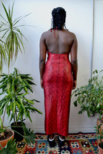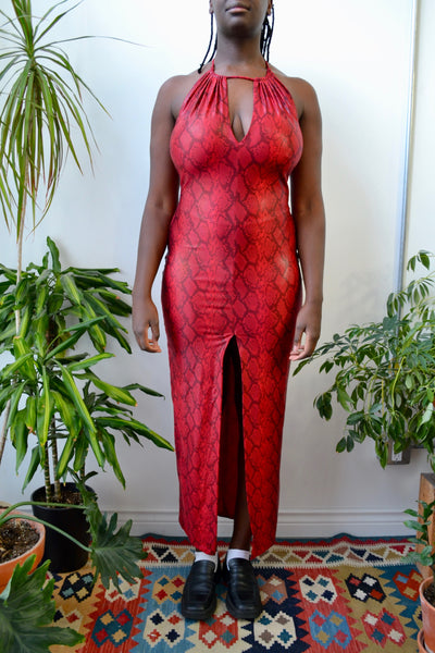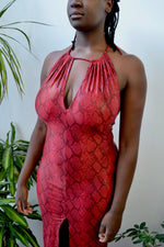 "Gunne Sax Millennium 2000" Red Snake Print Bodycon Dress. Halter Collar With Slit Neckline. Open Back. Zipper Closure Up Back. Slit Up Front. Unlined.