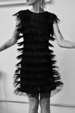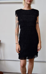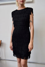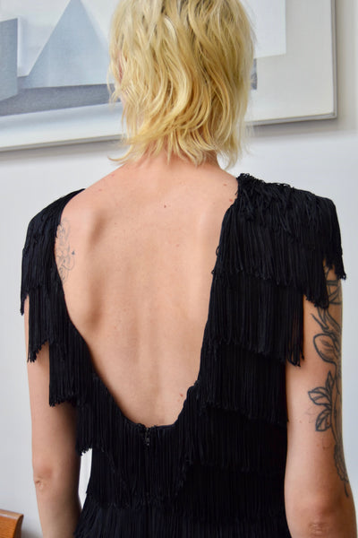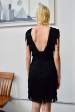 Vintage Black Fringe Dress. Cap Sleeves. Low Back. Talon Zipper Closure Along Back.