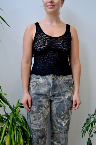 Nineties Black Lace Stretchy Tank Top. See-thru. Unlined.
