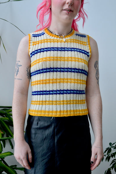 Blue, Cream and Yellow Striped Sweater Vest Top. Crew Neck. Unlined.