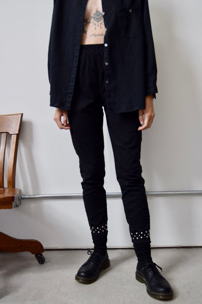 Black Stretchy Cotton Legging Pants. Elasticized Waist. Tapered Led. Silver Round Studs Along Hem.