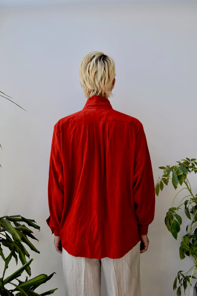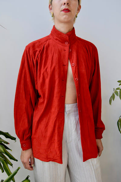 Eighties High Collar Red Suede Button Up Shirt. Shoulder Pleats. High Band Collar. Unlined.